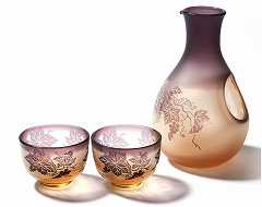 いくつか候補はあったんだけど、私の足を止めさせたのが、この「彫刻夢柄子(ゆめがらす)」のコーナー。中でも、「ぶどう紋 ポケット徳利 酒器三点揃」に一目惚れしちゃいました!